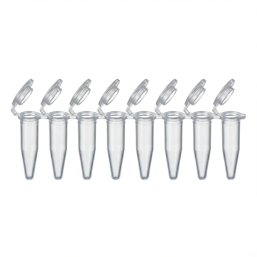 استریپ تیوب 0/2 میلی‌لیتر 8 تایی، درب متصل، شفاف، مخصوص PCR – بسته 120 عددی – مناسب PCR و qPCR